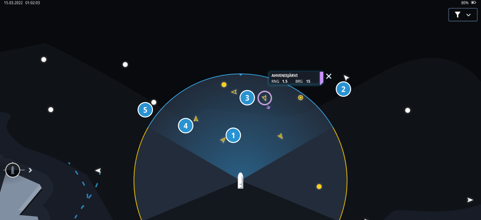 マップ画面は、常にすべての検出(最大50まで)が表示されます。薄い白い円は、現在の検出範囲の端を示しています。